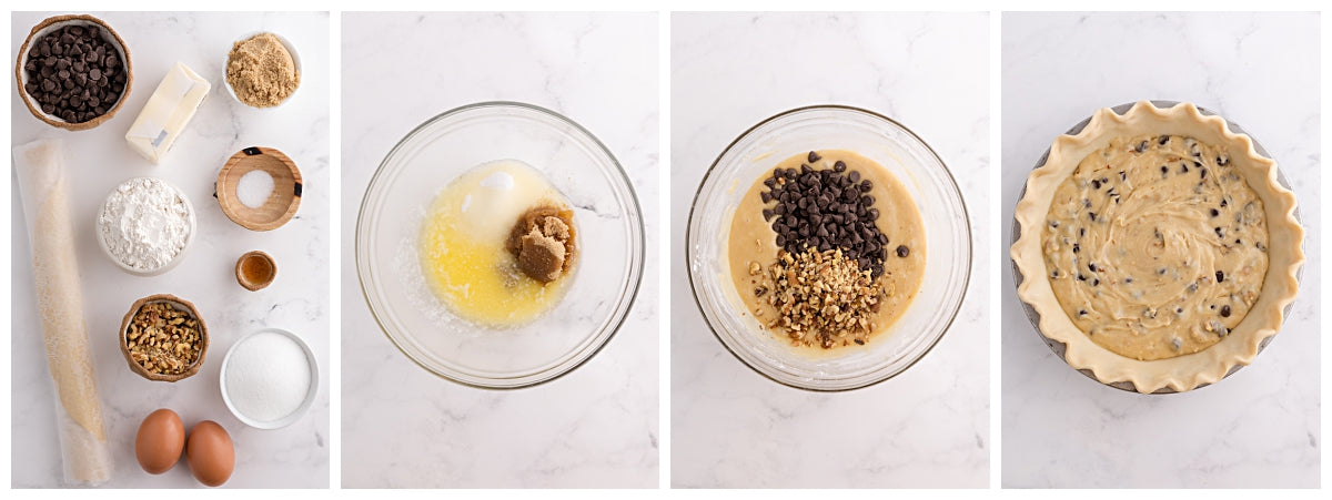 Featured Ingredients: pie crust, butter, granulated sugar, brown sugar, eggs, flour, semisweet chocolate chips, and walnuts.