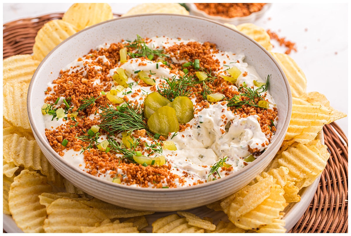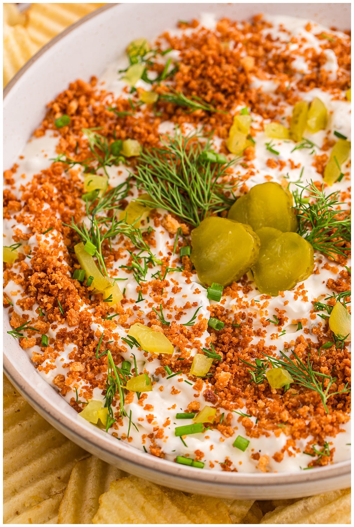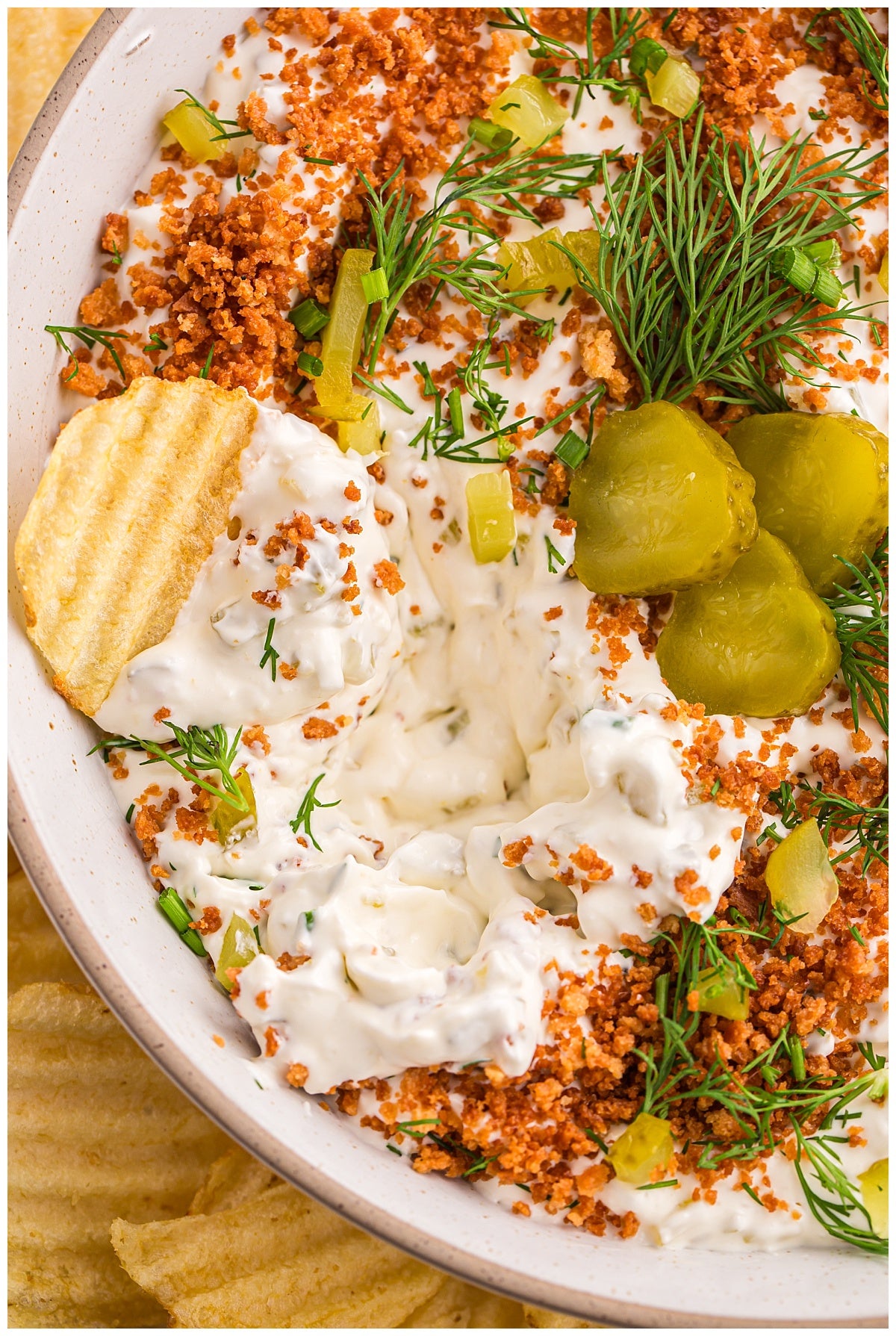 Featured Ingredients: butter, panko breadcrumbs, cream cheese, dill pickles, sour cream, mayonnaise, pickle juice, sugar, onion powder, garlic, and fresh dill.